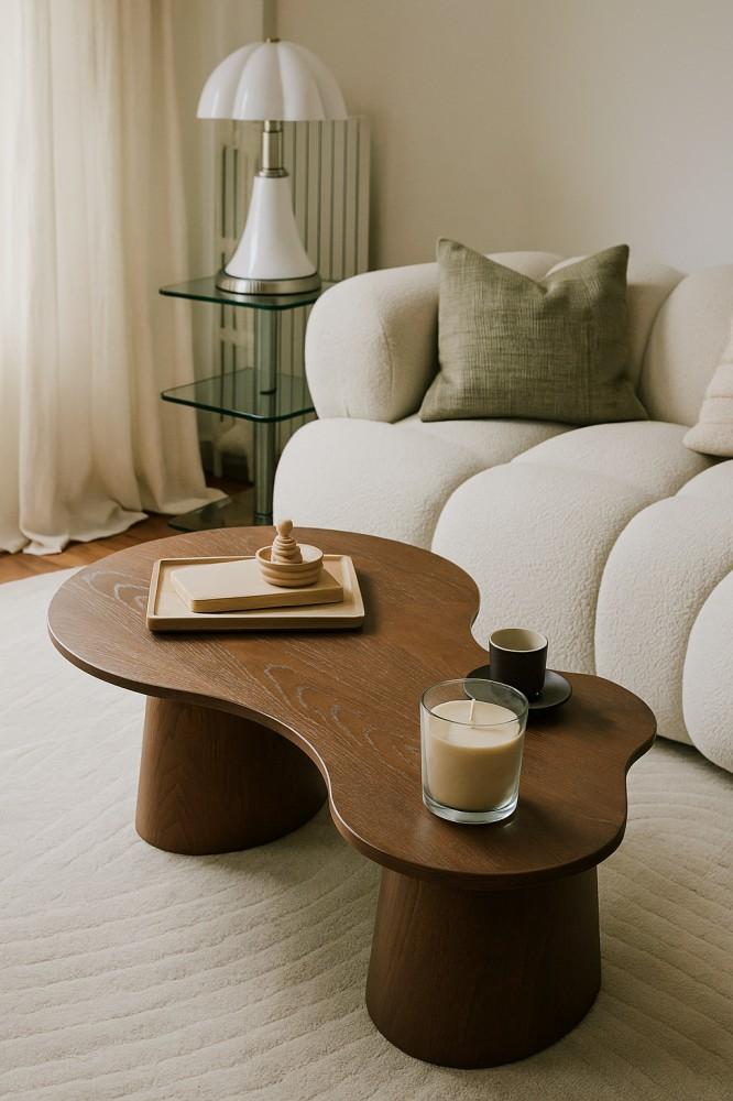 هذه طاولة قهوة أنيقة مصنوعة من خشب السنديان الطبيعي، بتصميم عصري وغير تقليدي على شكل عضوي منحني يمنحها لمسة فنية مميزة تضيف دفئًا وأناقة لأي غرفة معيشة.