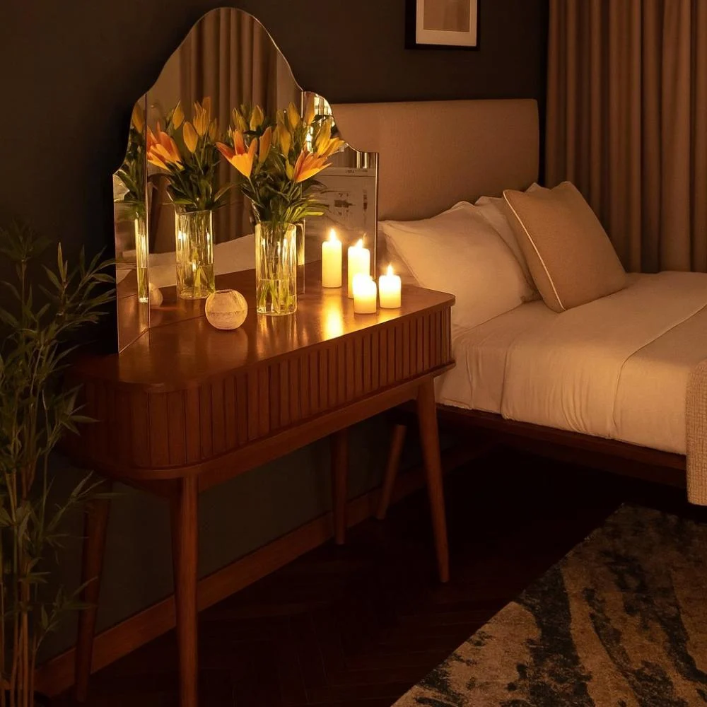 تسريحة خشب سنديان مع مراية الهبة تأتي بتصميم أنيق وفاخر يضفي لمسة من الفخامة والدفء على غرفة النوم. تتميز بجودة عالية في التصنيع بفضل خامة السنديان الصلبة والمتينة، مع لمسات عصرية تضيف مظهراً راقياً وعملياً في آن واحد. المراية الواسعة بتصميم الهبة تزيد من الإحساس بالرحابة وتكمل جمال القطعة، مما يجعلها محوراً أساسياً في الديكور.