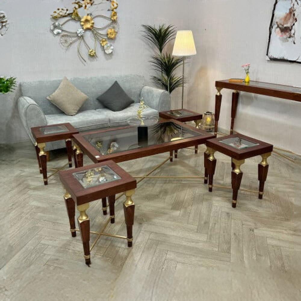 طقم طاولات ضيافة خشبية بسطح قزاز شفاف خمس قطع