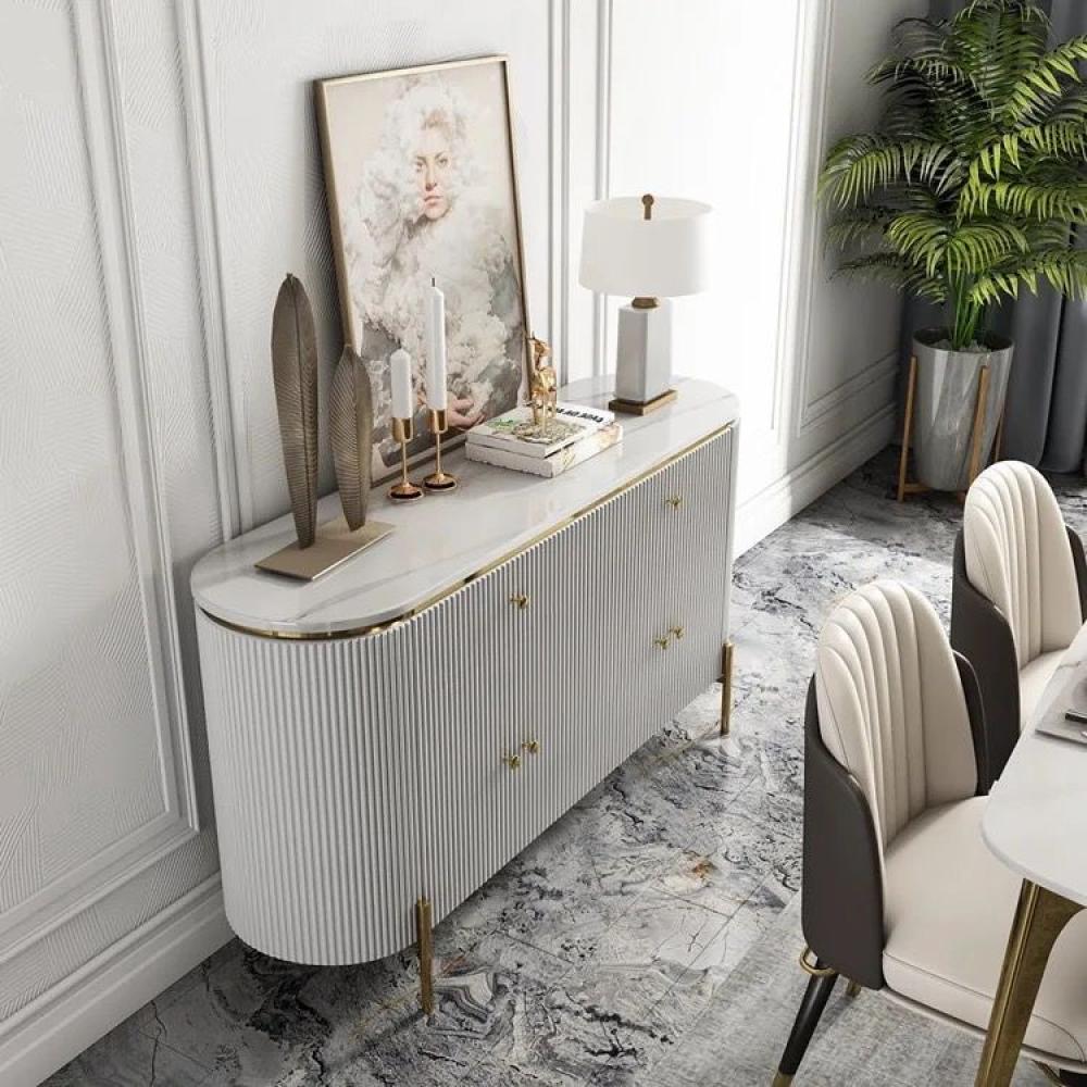 بوفيه أنيق وراقي، بتصميم عصري يجمع بين اللون الأبيض واللمسات الذهبية الفاخرة، مصنوع من خامات خشبية متينة مع أرجل ومقابض معدنية لامعة. يناسب المداخل، غرف المعيشة، أو الاستقبال، ويُصمَّم خصيصاً حسب طلبك ليناسب ديكور منزلك. السعر يصل إلى 1099 ريال.
